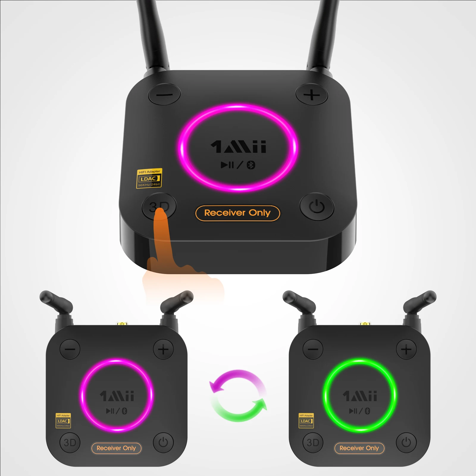 This Bluetooth adapter also supports aptX HD and aptX Low Latency. And the 3D audio can be switched on or off by pressing the “3D” button on the Bluetooth audio receiver. The green LED will be on when switched to 3D audio.