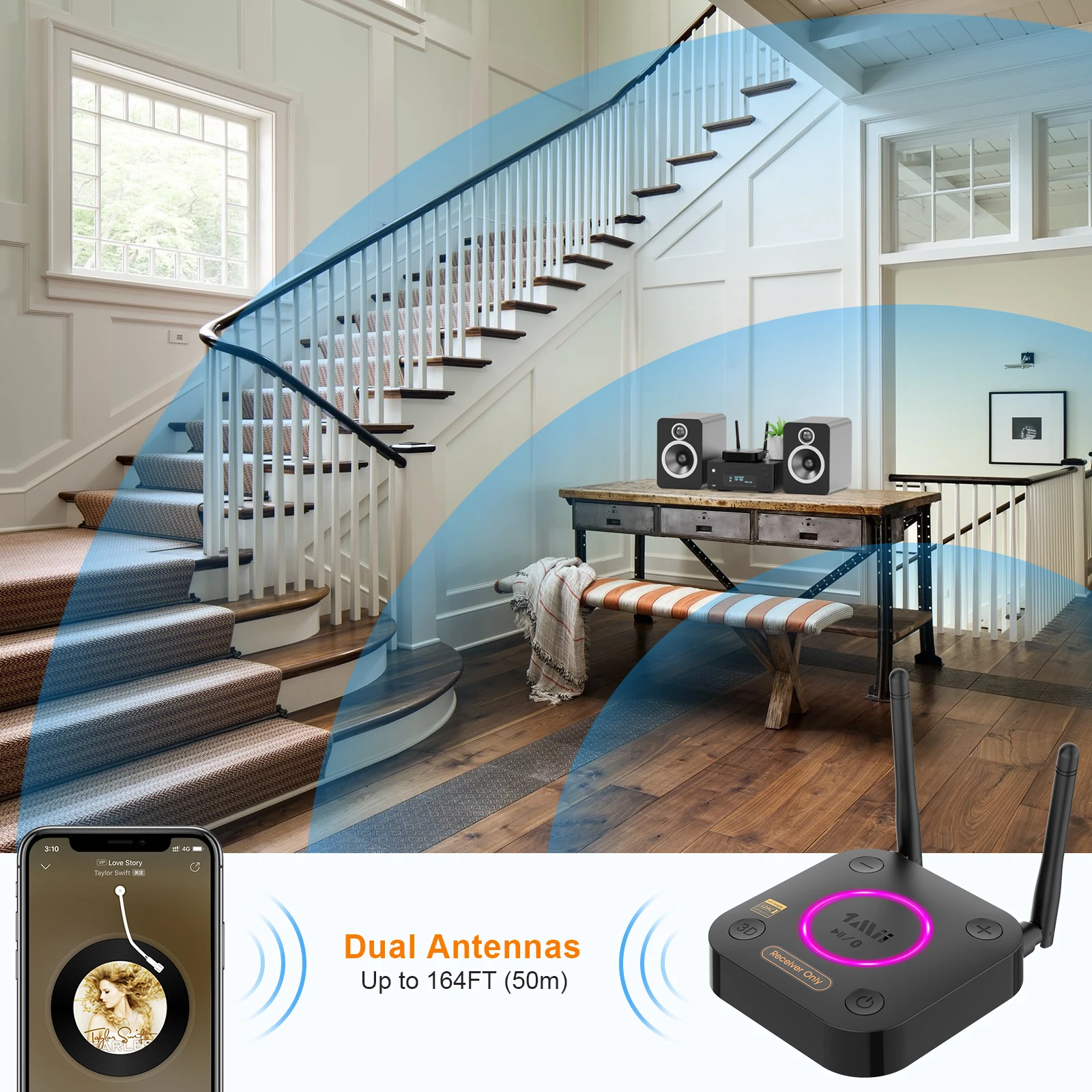With dual antennas and class 1 Bluetooth technology ensure that the 1Mii B06Ultra Long Range Bluetooth receiver can achieve a range of up to 100ft line-of-sight in the open air and up to 50ft indoors(without obstacles). NOTE: operation range can be affected by WiFi routers or antennas on the stereo receiver, etc.