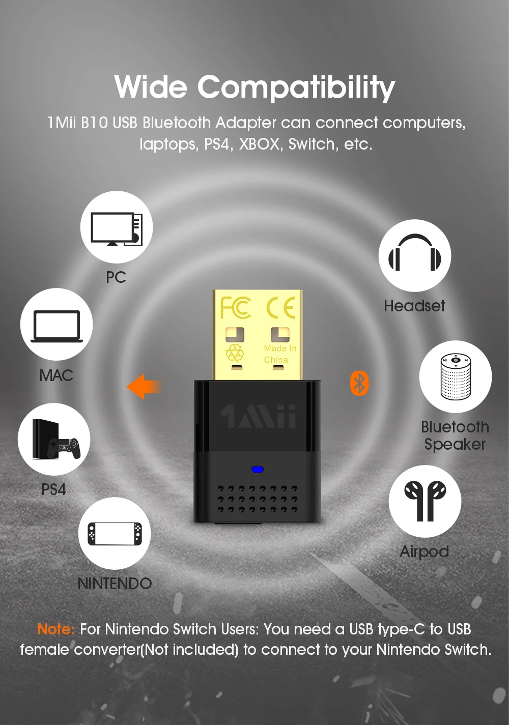 1Mii B10 USB Bluetooth Adapter can connect to many devices, such as computers, laptops, PS4, Switch, etc., and then transmit HD sound quality to Bluetooth headsets and Bluetooth speakers. Let you enjoy the wireless HD music experience.