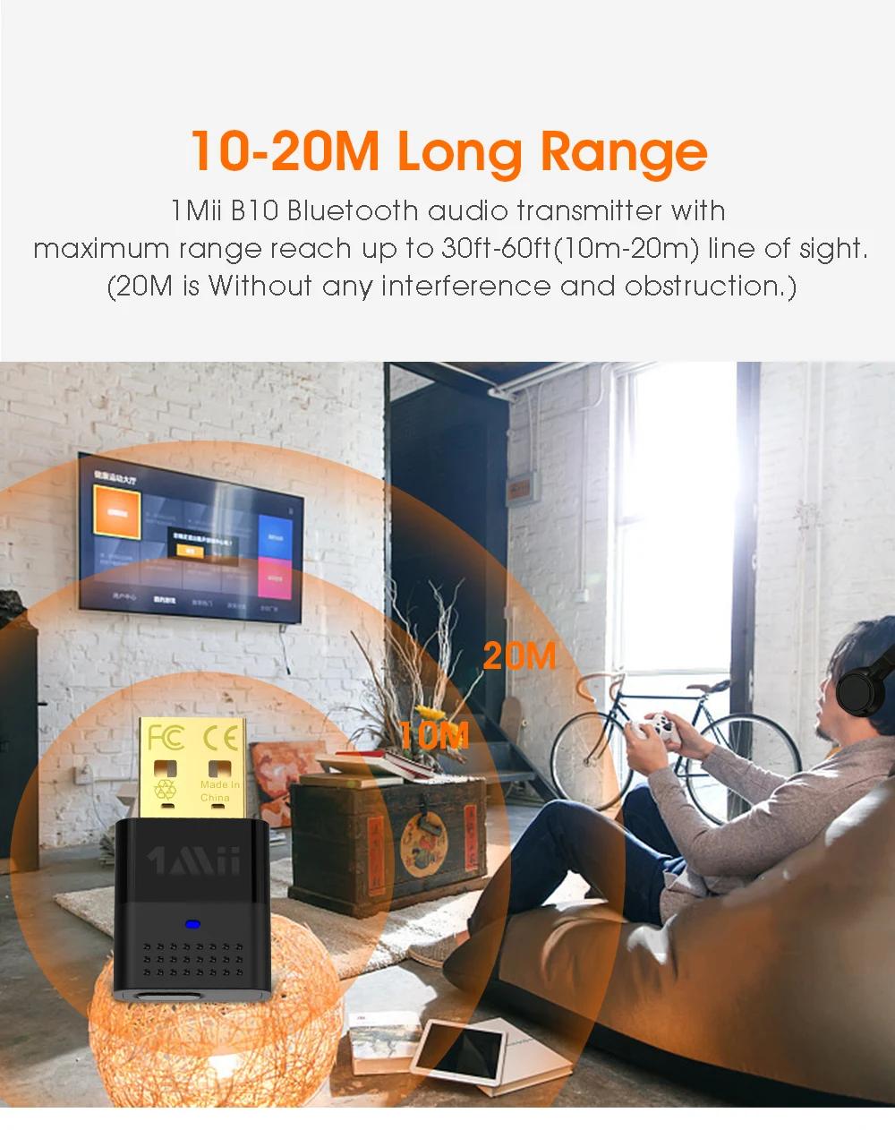 1Mii B10 Bluetooth Audio Transmitter with maximum range reach up to 30ft-60ft(10m-20m) line of sight. (20M is Without any interference and obstruction.)