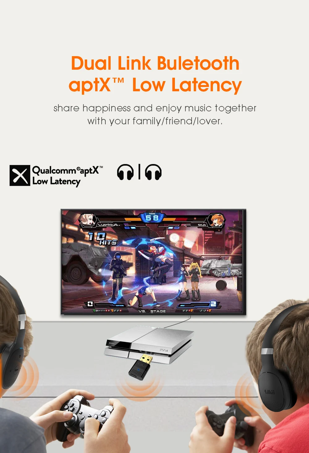 APTX low latency + APTX HD technologies deliver up to 80% lower latency and transmit HD sound quality. Whether you’re playing games, listening to music, or watching movie, you’ll experience no lip sync delay and sound effect with much higher quality.