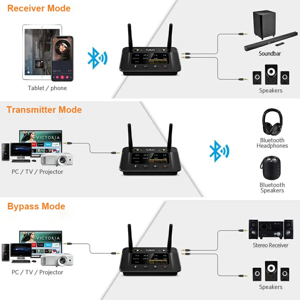 Designed for versatility, it operates in both transmit (TX) and receive (RX) modes, making it perfect for upgrading TVs, amplifiers, home stereos, or car audio systems with high-resolution wireless connectivity.