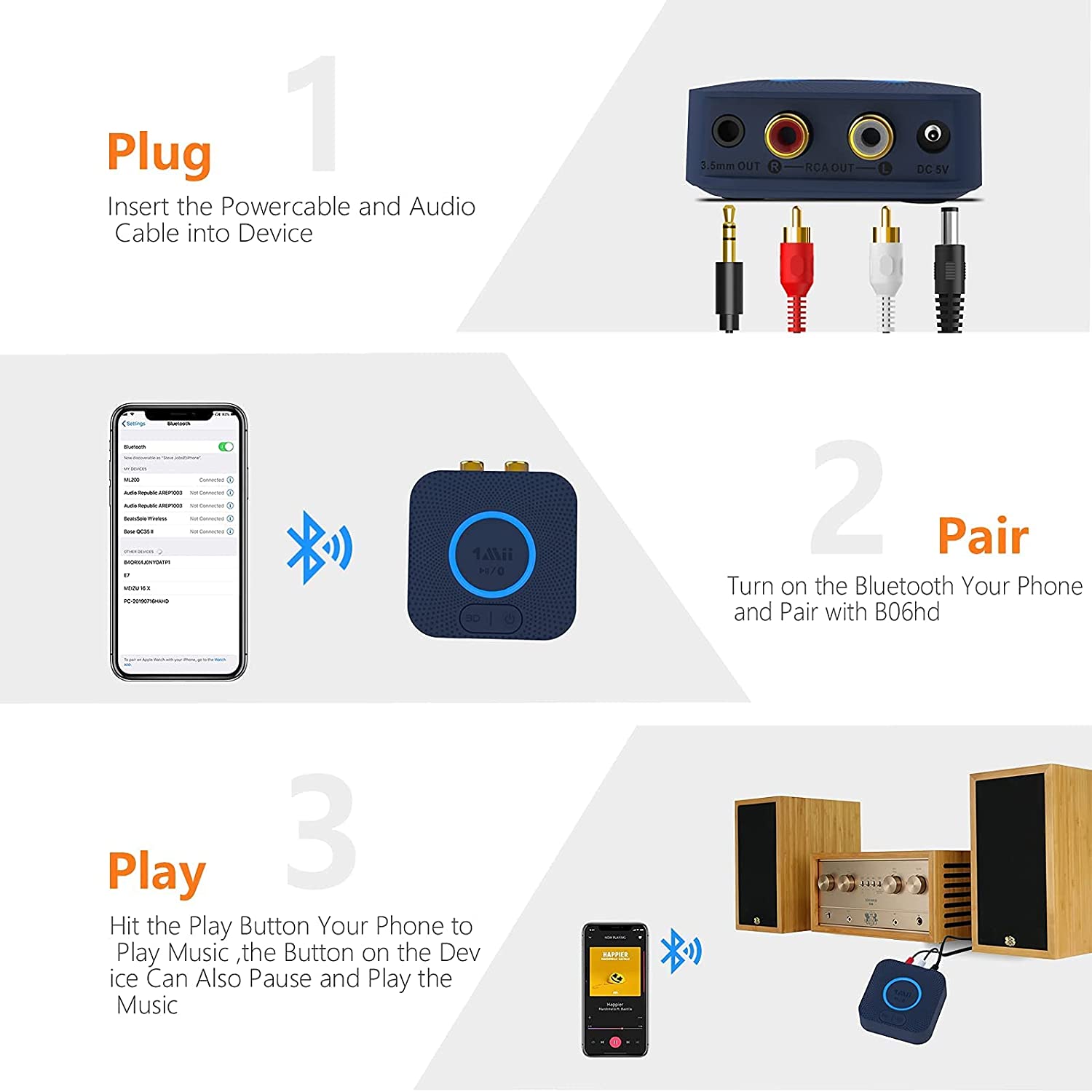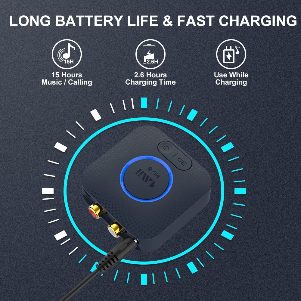 Equipped with a 210mAh built-in lithium battery, the receiver offers portable convenience with continuous playback time, and can be charged via standard 5V DC power. The built-in antenna ensures strong connectivity, with a wireless range of up to 131ft (40m) in open space and 15m indoors.